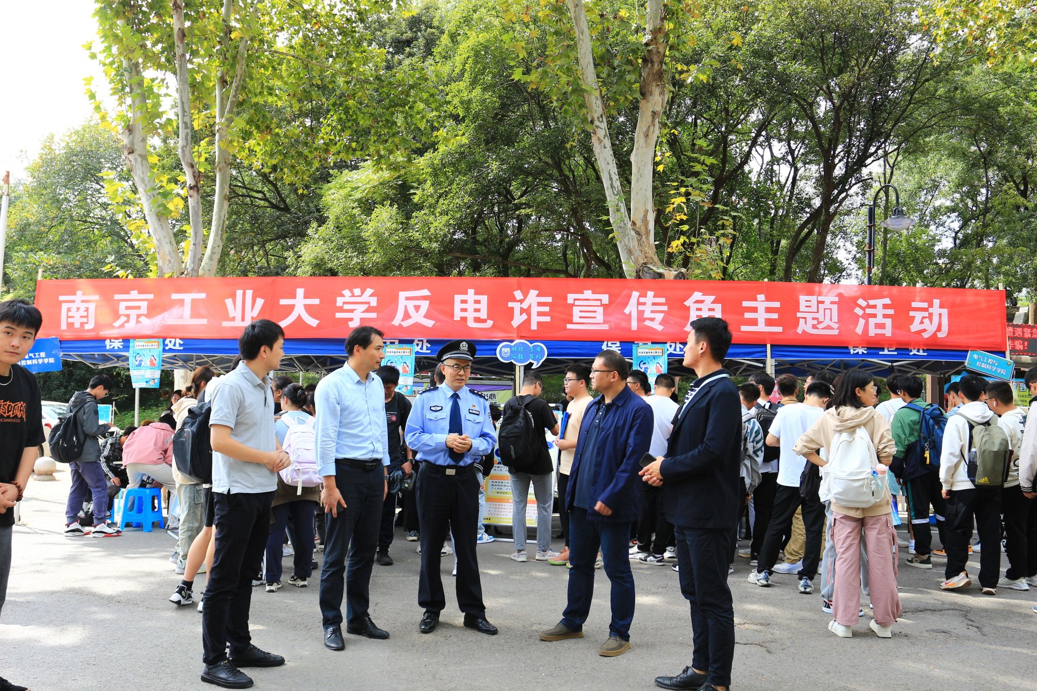 为进一步加强反电诈宣传教育,创建无诈校园,10月13-15日,保卫处、best365官网在江浦校区象山宿舍区联合举办反电诈宣传角主题活动。南京市公安局江北新区分局内保支队四级高级警长叶江山、保卫处副处长李智、best365官网副书记于志杰等出席活动。