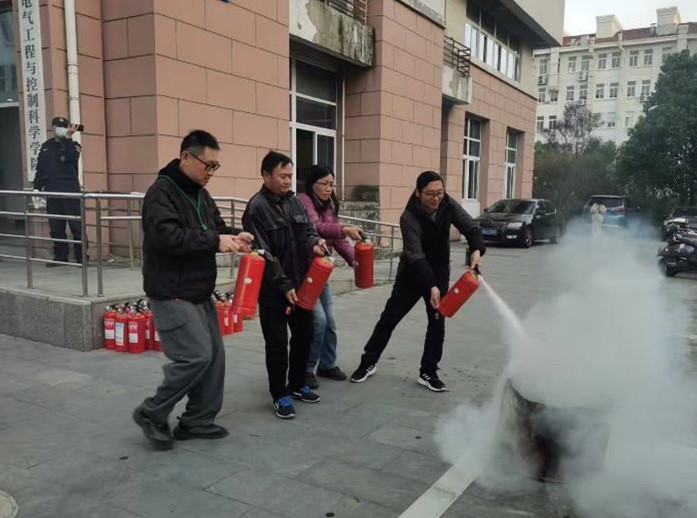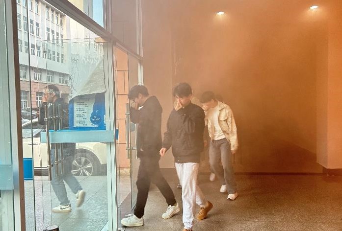培训之后,在保卫处的协助下,公司组织全体师生开展消防应急演练。随着警哨声响起,全体师生迅速有序地从消防通道和安全出口撤离,疏散到楼下安全地带。在保卫处工作人员指导下,现场每位师生依次手持干粉灭火器进行初起火苗扑灭的实训,整个演练过程井然有序,取得了预期效果。